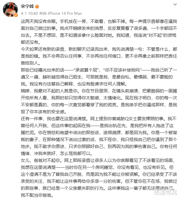 出轨风波过去十天,张婉婷终于发声了。4月11日,她在社交平台发布长文,这是自宋宁峰承认婚内出轨后,她第一次公开表态。