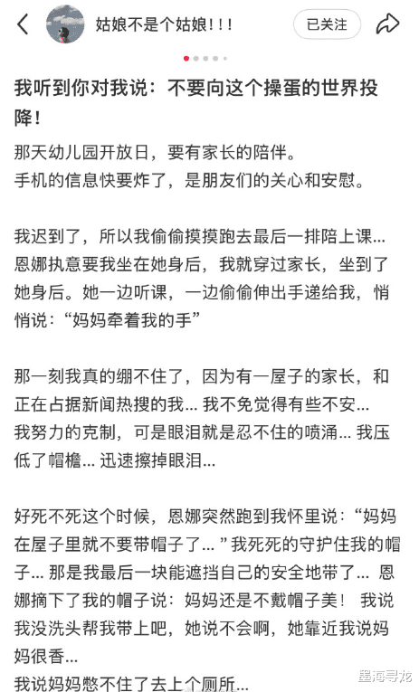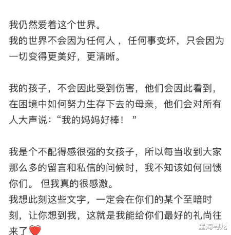 文中没有控诉,没有撕扯,甚至没有提到那个曾经让全网讨论的名字。她只说,自己仍然爱着这个世界。她的世界不会因为任何人、任何事变坏,反而会因为这一切变得更清晰、更美好。