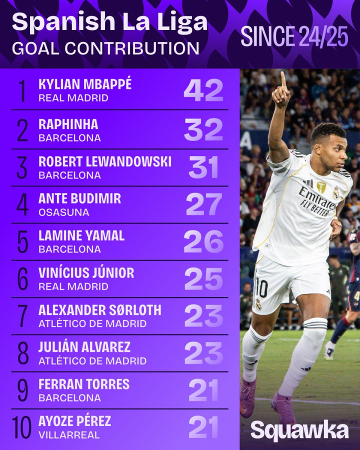 虎扑09月25日讯根据Squawka的数据统计,姆巴佩是自上赛季开始以来西甲联赛中进球加助攻最多的球员。⚽