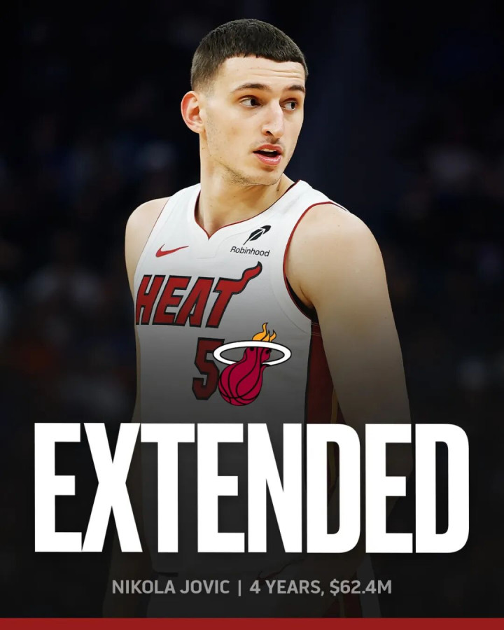 来自名记Shams的报道,据经纪人透露,热火已经和球队前锋尼古拉约维奇达成提前续约,合同为4年6240万,后续消息,这份合同全额保障,不含任何球员选项或者球队选项。