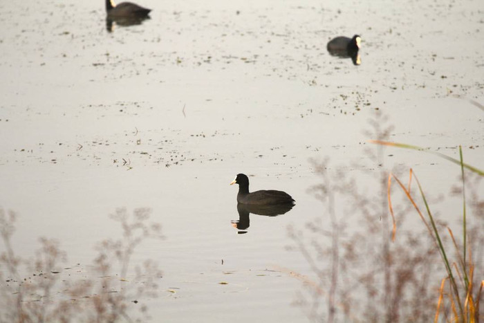 12月10日上午,冬日的阳光洒在汉安湖上,波光粼粼的水面泛起金色光晕。放眼望去,上百只白骨顶鸡在湖中或分散游弋,或聚群停歇,在暖阳映照下格外显眼。仔细观察,每只鸟前额都有一块白色角质额板,好似戴着一顶小巧的“小白帽”,与灰黑色的羽毛形成鲜明对比。