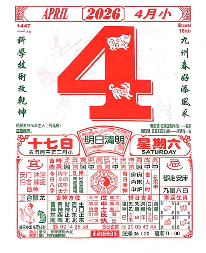 黄历心中过,遇事不出错。4月4日,星期六,农历二月十七,大家可以先留下一句:顺势而为。祝福一下自己。这天值神是白虎。象征威严与肃杀,主刑伤与变动。它提醒我们,这天在处理重要事务时,需格外注意细节,遵守规则,不可轻率行事,尤其是在文书、合约方面。这天是执日,代表“执行”与“维持”。这是一个适合完成既定计划、巩固已有成果的日子,但不适合贸然开启全新的、毫无准备的大项目。穿衣颜色推荐蓝色、黑色、灰色系。不推荐绿色、青色、翠色系。打麻将求职找工作的可以去北边,约会谈恋爱的可以约在东南边。生肖注意事项,小鼠鸿运当头,小牛阻力较大,小虎大发雷霆,小兔起伏不定,小龙洞察力强,小蛇顺心如意,小马积极上进,小羊诸事不顺,小猴好运降临,小鸡做好管理,小狗神采奕奕,小猪圆融一些,有缘刷到,祝你开心,福生无量。