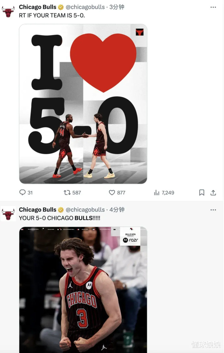 本赛季目前为止,还维持不败的只有3支球队:公牛、雷霆和马刺,今天76人输球了,输给凯尔特人。公牛上一次拿到开赛5连胜,要追溯到1996赛季,那还是神的时代呢。你瞧给公牛官方激动到!!!