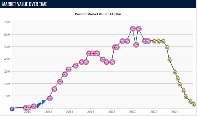 2021年夏窗阿拉巴与拜仁合同到期,随后自由身加盟皇马,29岁的他发挥余热在皇马也夺得了不少冠军。30岁时阿拉巴身价尚有5500万欧,但受伤病影响,仅仅3年便降到只剩400万欧,跌回了最初闪耀霍村之时的身价。