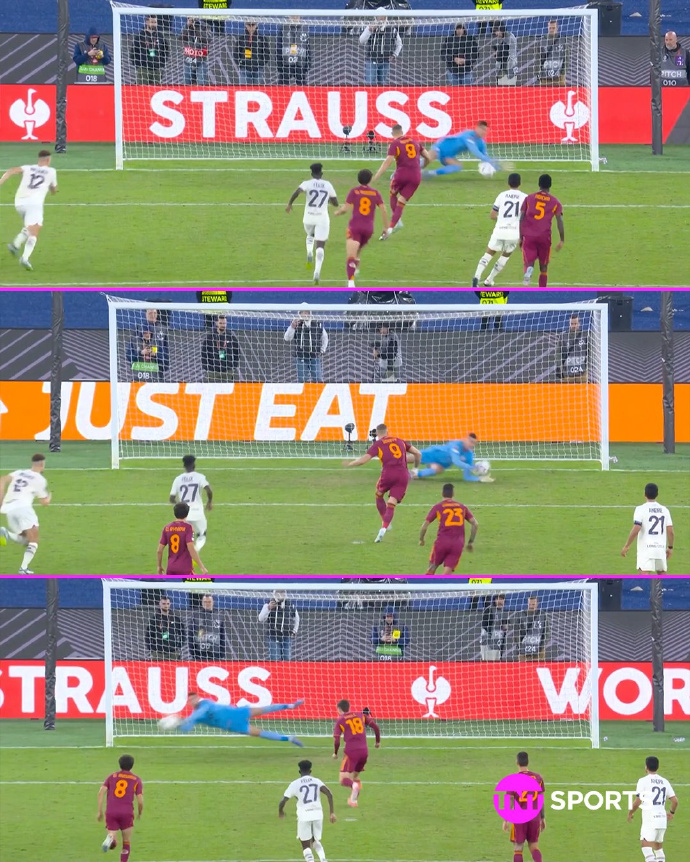 三次机会、两位罚手、两种角度,全被同一门将挡在门外,罗马就此创造欧战历史首次同一点球三连丢的纪录。连67岁的主帅加斯佩里尼都看傻了:“我从没见过这种事,这是独一无二的偶然”。
