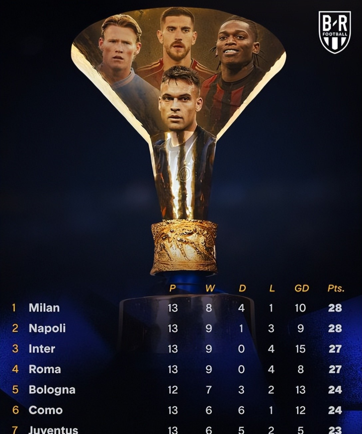 由于博洛尼亚的第13轮要在12月2日的凌晨开打,所以目前的意甲看上去只是前4名相差一分的情形。但考虑到第13轮的博洛尼亚将要对阵的是克雷莫纳塞、而球队本赛季的8个各项赛事的主场5胜3平保持不败且其中还有2-0击败那不勒斯的情形,可能第13轮之后的意甲完整积分榜真的会令人大吃一惊。