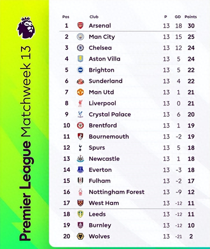 第13轮全部战罢之后,排名第1-4位的球队分别是阿森纳(30),曼城(25)和切尔西以及维拉(24)。